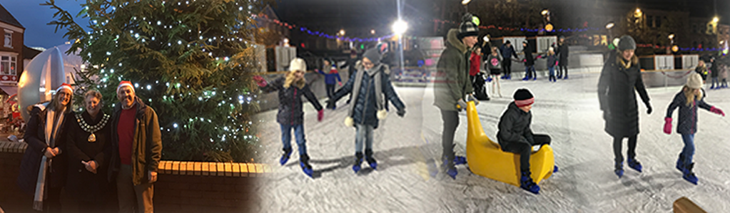 Above: Beth Sheridan (Family Solicitor, Hopkins), Yvonne Woodhead (Ashfield District Council), and Russell Jones (Personal Injury and Legislation, Hopkins) standing in front of the Hopkins Solicitors sponsored Christmas tree at Portland Square, Sutton Town Centre. And celebrations at The Mansfield One Call Ice Rink.